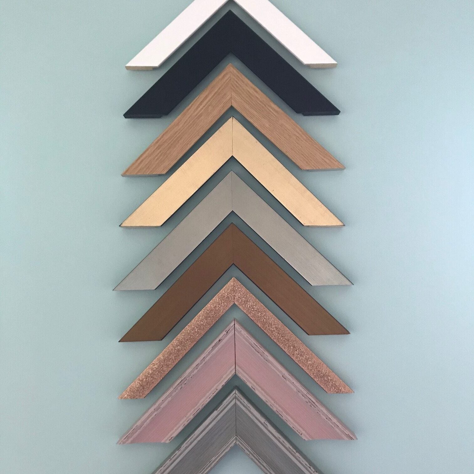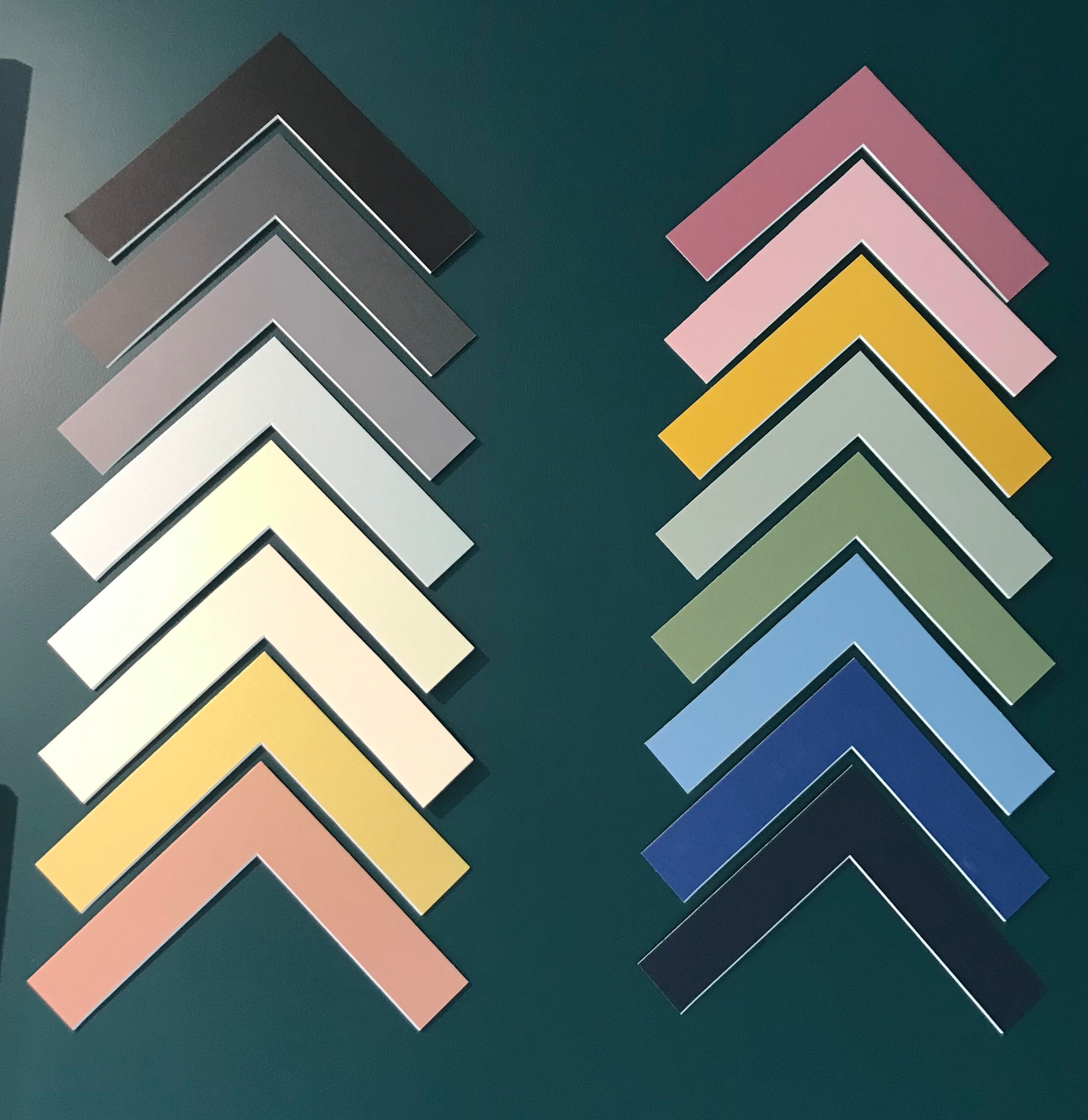 There are 19 different mount board colour options, used for the background of the frame and the front border. These include: dark grey, mid grey, gold, silver, bronze, champagne, deep pink, pale pink, mustard, daffodil yellow, pale sage green, apple green, baby blue, royal blue, navy, black, white and ivory.