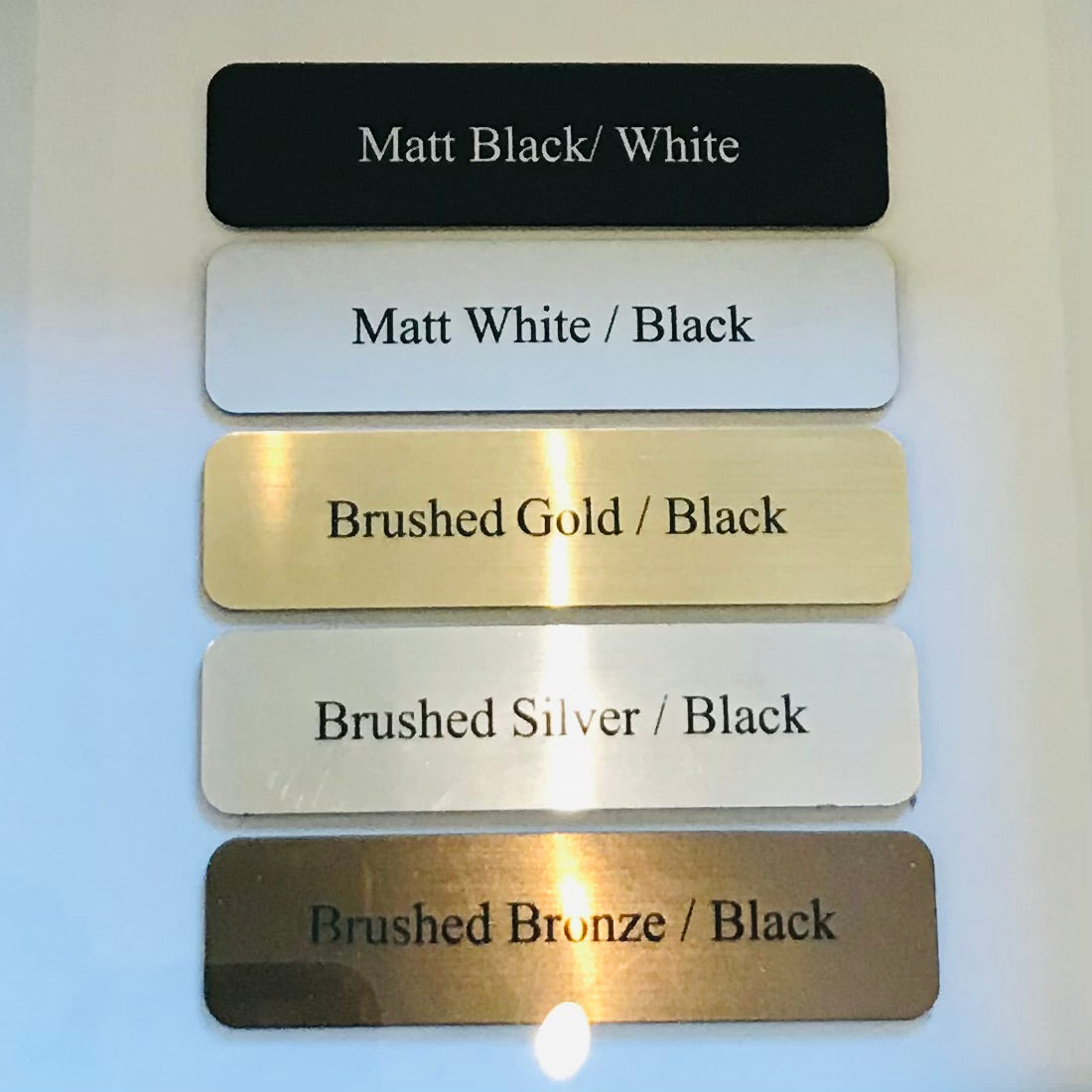 The metal name plaques come in: black, white, gold silver or bronze, and can be engraved in arial or script font.