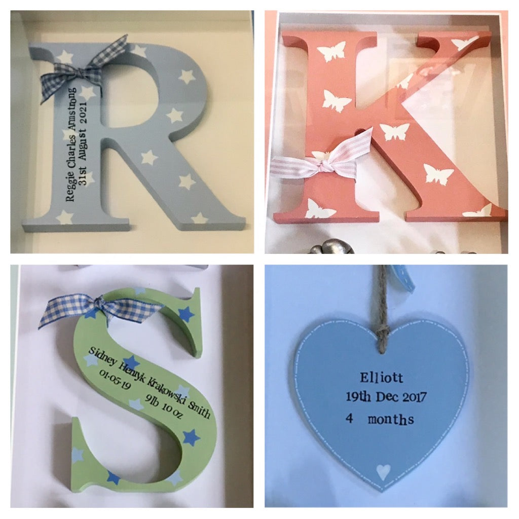Wooden plaques are available in a heart or star shape in the following colours: baby blue, baby pink, sage green, white, grey, pale yellow, mustard and lilac. Your baby's name and age can be hand-stamped onto the plaque to further personalise it.
