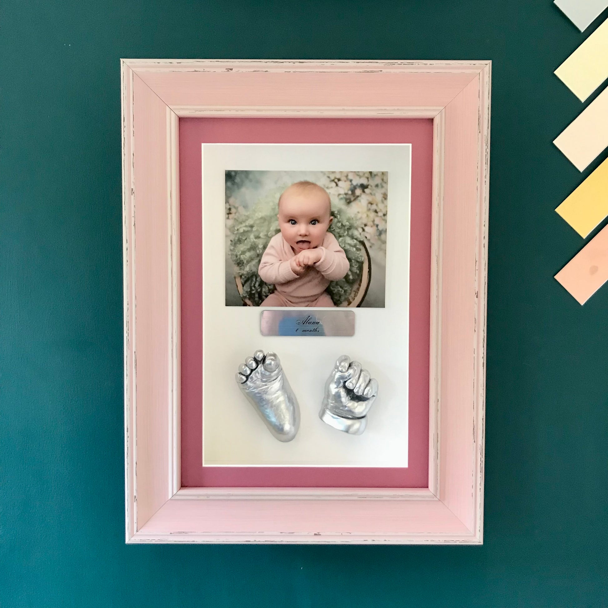 After you leave my studio, meticulous care and attention is given to turn these moulds into plaster ‘sculptures’ of your child's hands and feet. They are hand painted in your choice of colour, replicating real metal castings at a fraction of the cost. Your finished casts are then displayed in a frame combination of your choice.