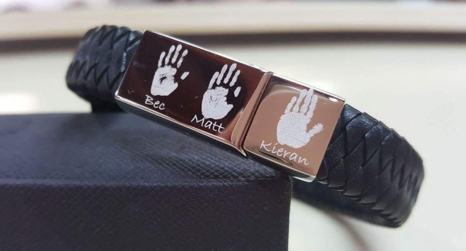 Add your children's prints with their names. This men’s bracelet is from the engraved range which means prints are engraved onto the surface.