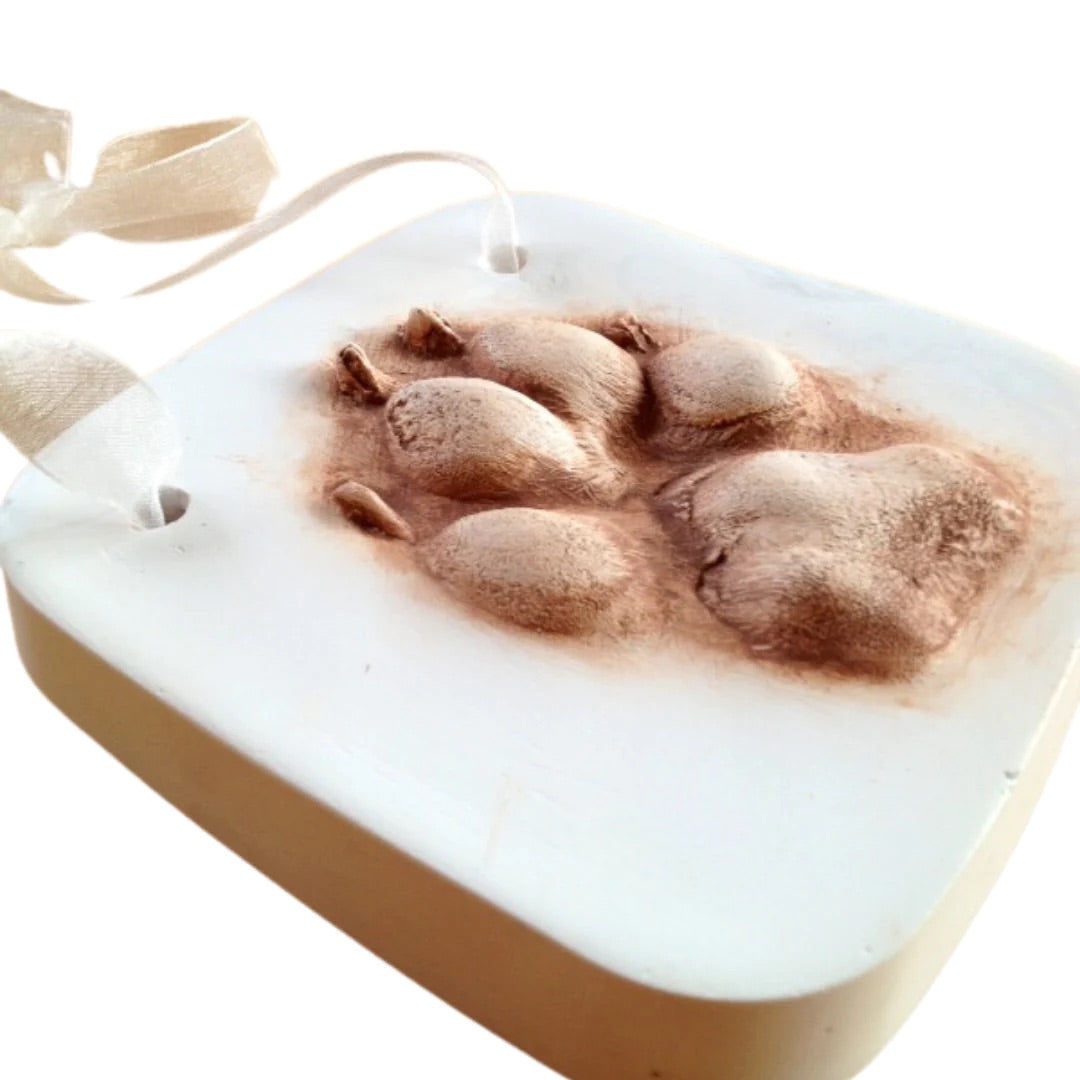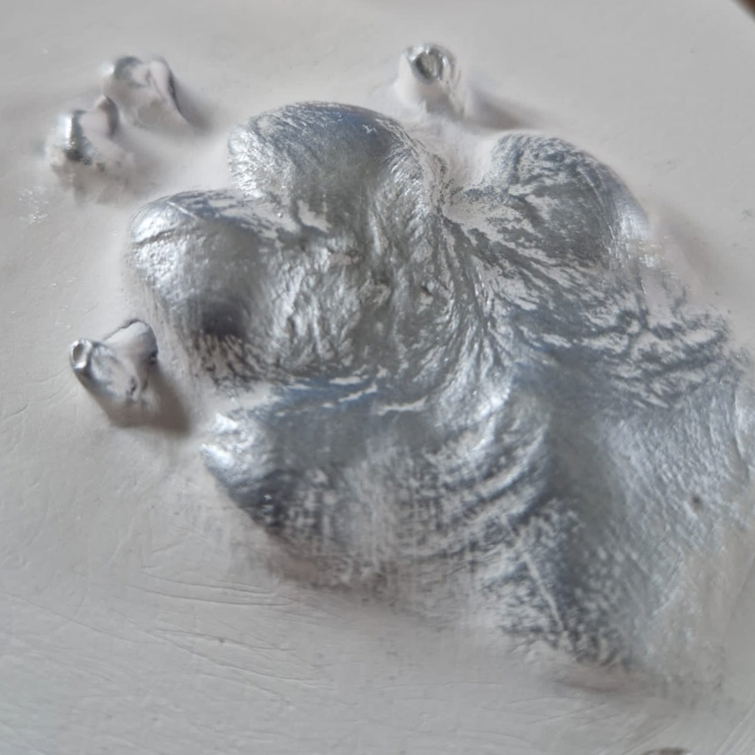 Outprint tiles are created by gently pressing your pet's paw into natural terracotta clay for a few seconds to create an impression. This imprint is then cast in fine stone plaster to create a raised 'outprint'. The outprint tile will show the contours of the pads, fur and claws.